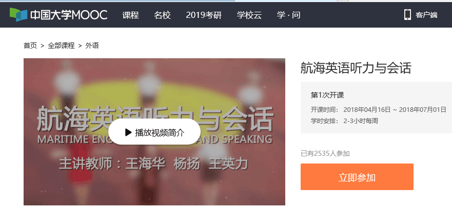 为了提高航海类专业学生英语应用能力,用英语普及航海基础知识,由大连海事大学外国语学院辽宁省教学名师王海华教授与外研社“教学之星”大赛全国总决赛冠军杨扬老师、亚军王英力老师共同设计并主讲的《航海英语听力与会话》于4月16日在中国大学MOOC(慕课)网正式上线。开课一周来,选课人数已超过2500人。