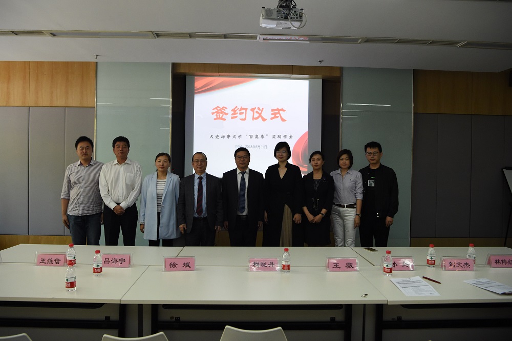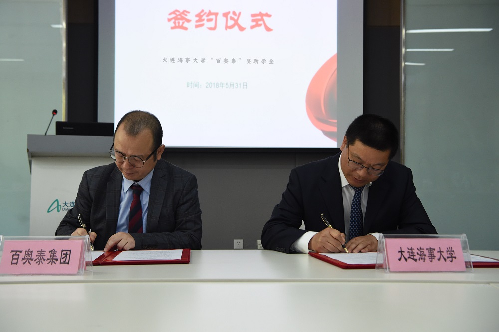 梅晓丹与徐斌共同签署了《大连海事大学外国语学院“百奥泰奖助学金”捐赠协议书》。
