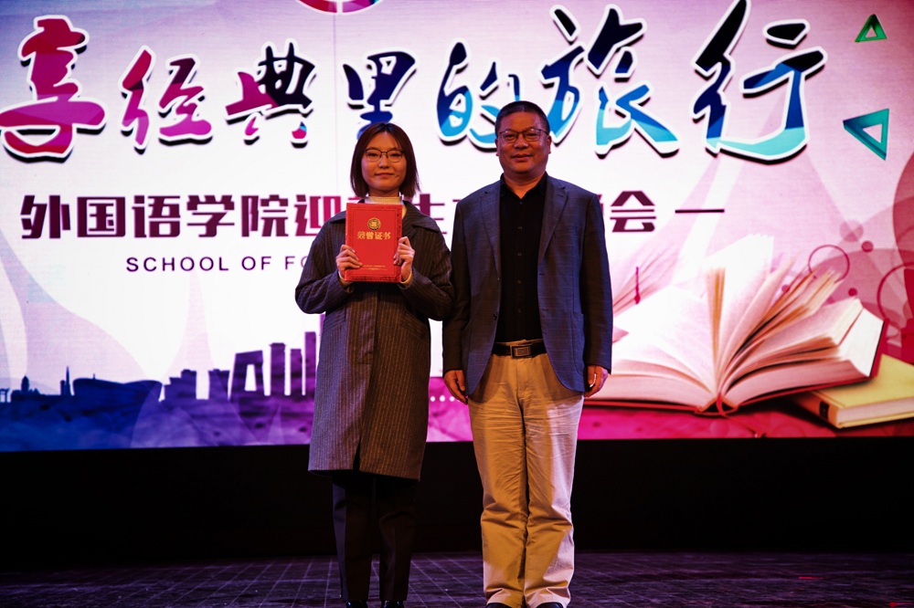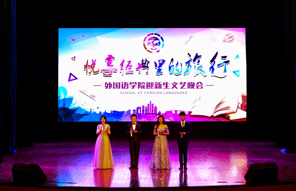 10月26日,外国语学院在新大活多功能厅举办2018年迎新生主题晚会。晚会以“悦享经典里的旅行”为主题,将同学们阅经典作品的感悟与思考搬上舞台,将体验式阅读进行到底。学生工作部副部长徐德江、外国语学院全体领导班子成员、教师代表、2018级新生军训承训教官参加晚会。