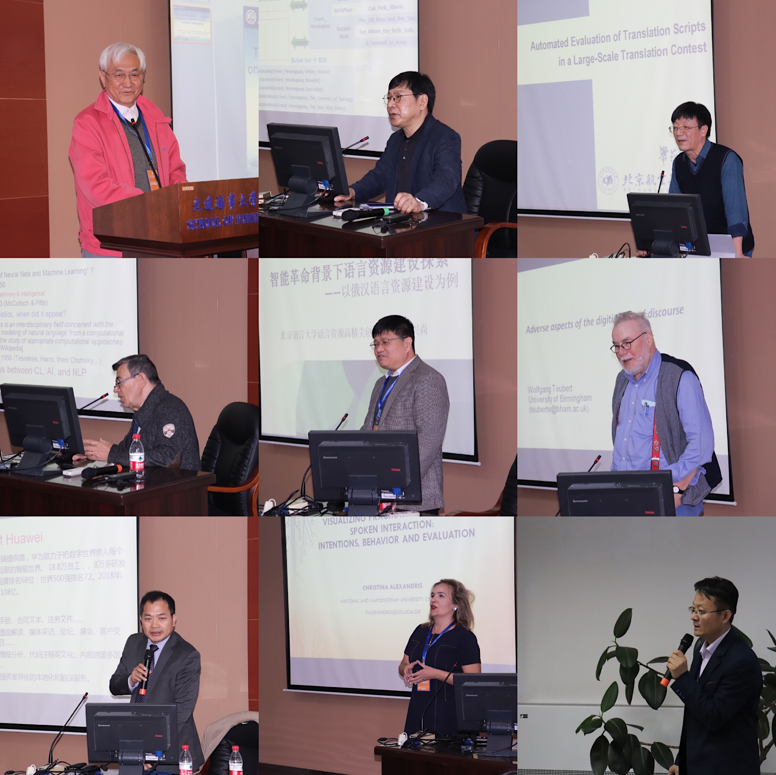 开幕式后举行了为期一天的主旨报告。教育部语言文字应用研究所研究员冯志伟教授、韩国科学技术院计算机科学Key-Sun Choi教授,北京航空航天大学梁茂成教授、法国格勒诺布尔大学Christian Boitet教授、语言资源高精尖创新中心特聘研究员傅兴尚教授、英国伯明翰大学Wolfgang Teubert教授、希腊雅典大学Christina Alexandris副教授、中国翻译协会第七届理事会副会长兼本地化委员会陈圣权教授、大连外国语大学语言学研究基地主任邓耀臣教授先后进行主旨发言。与会专家学者从不同角度,介绍智能时代发展大势,通过丰富案例、建构语言模型,围绕机器翻译优缺点、智能翻译技术、计算机语言处理、语料库语言学研究等议题,深入开展人工智能时代对语言学及其教学的研究探讨。此外,与会专家学者还围绕人工智能翻译技术的最新研究成果、人工智能翻译技术下一步研究发展开了交流讨论。