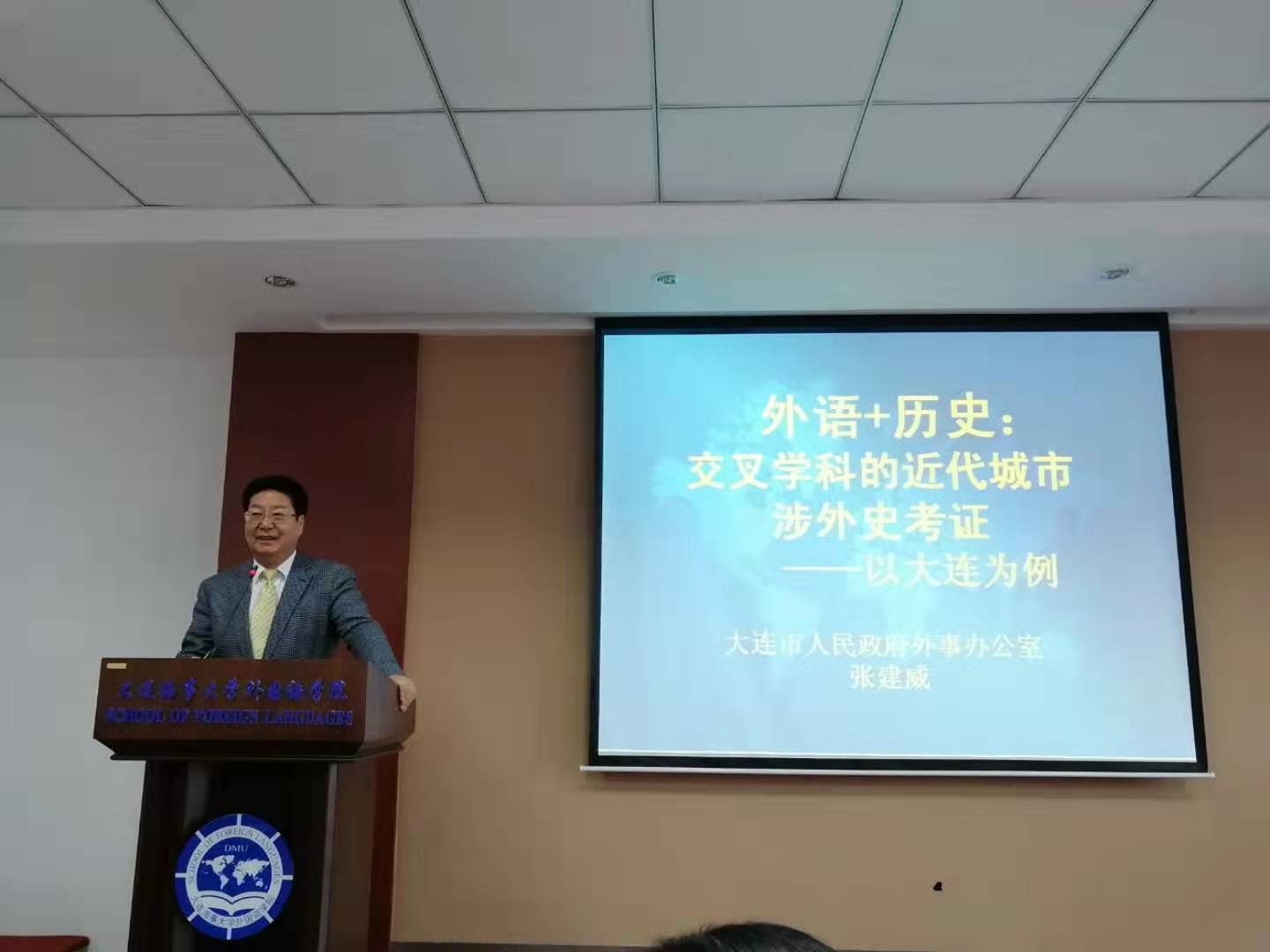 11月29日上午,应大连海事大学外国语学院邀请,大连市政府办公室正局级巡视员、中国翻译协会专家会员张建威围绕“外语+历史:近代城市涉外史跨界研究——以大连市为例”为主题进行学术讲座。此次讲座在外语楼105报告厅举行,讲座由外国语学院MTI中心主任程昕教授主持,MTI中心副主任曲道丹、全体专硕学生参加讲座。