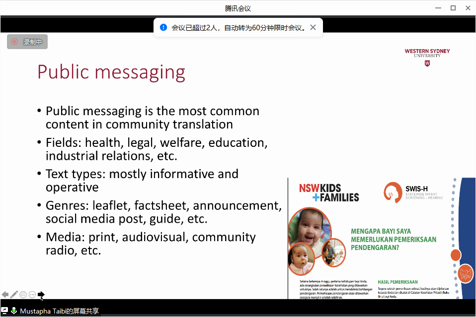 Taibi教授首先解析公共信息翻译这一概念的内涵与外延,探讨了公共信息翻译机遇与挑战。然后Taibi教授聚焦翻译领域创新,厘清了公共信息翻译的功能性,以丰富的实例探讨了公共信息翻译的现存问题及解决策略。该讲座迎合了我校翻译专业本科及研究生阶段人才培养的需要。