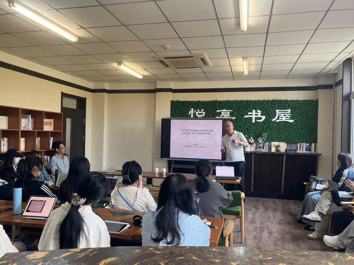2025年5月13日下午,袁博平教授应邀在我校外语楼悦享书屋开展题为“二语习得中的界面问题——以英语母语者习得汉语二语不及物动词为例”的学术讲座。本次讲座由外国语学院院长曾罡教授主持,吸引了众多语言学及相关专业师生前来聆听。