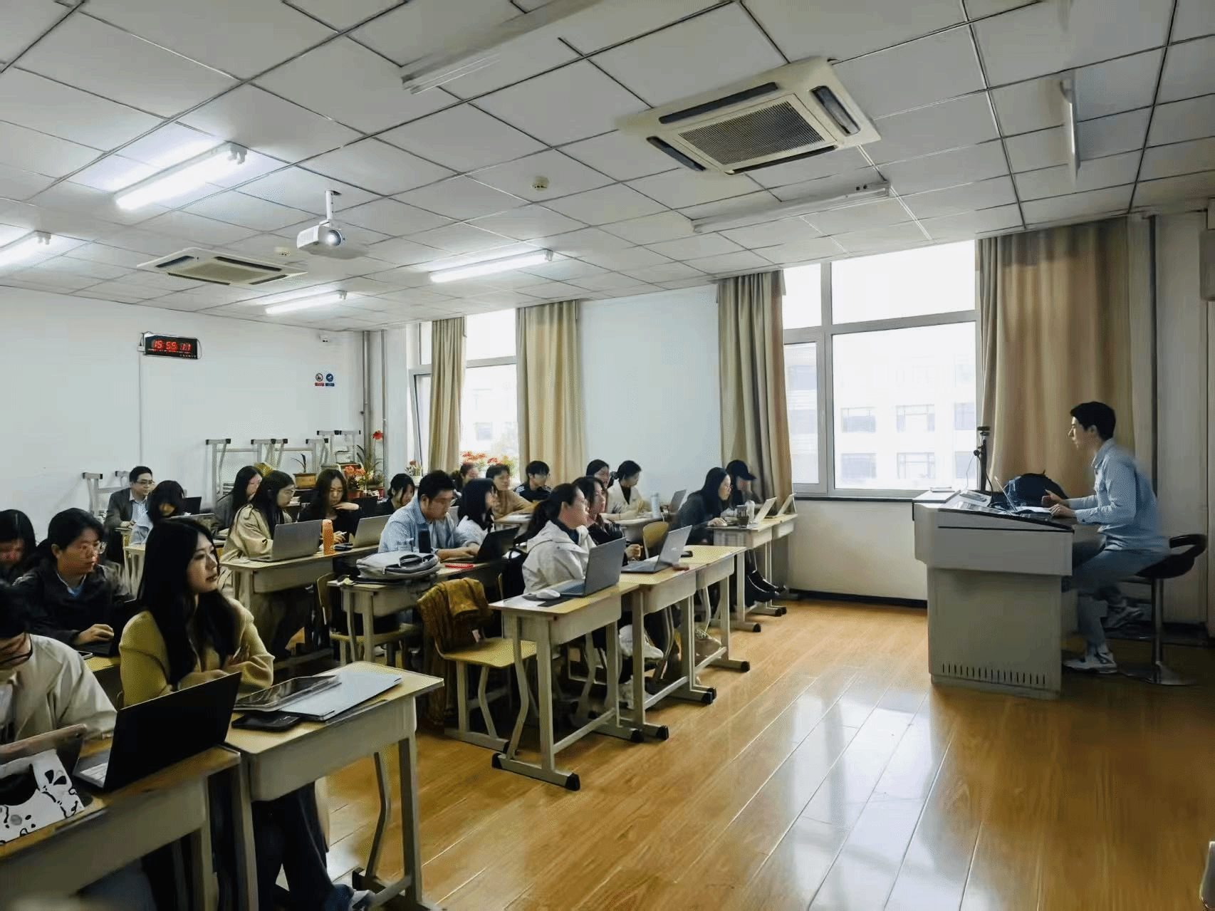 此次工作坊内容丰富、层层递进,既注重理论体系的构建,也强调实际操作的能力提升。首场培训以实操演示为主,帮助参训者全面了解R语言在现代数据工作流程中的应用潜力。随后,傅博士系统讲解了数据结构化处理、灵活转化方法,以及如何高效利用R语言构建清晰、可重复的数据整理流程。在统计建模环节,傅博士理论联系实践,结合多个科研案例,展示了R语言在传统统计推断与现代建模技术中的广泛适用性,涵盖回归分析、方差分析、贝叶斯方法等内容。可视化模块深入讲解了图形语法原理,演示如何用ggplot2等工具直观呈现数据结构,并引入Shiny平台拓展结果展示与交互功能。最后,工作坊将R语言与人工智能技术前沿结合,探讨语言模型与自动化分析接口的融合方式,为参训师生打开了数据科学与AI交叉领域的新视角。