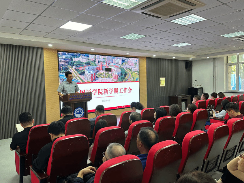 9月17日中午,外国语学院在外语楼105报告厅召开新学期工作会议,会议总结了学院上半年工作开展情况,并对新学期工作进行部署。学院领导班子成员和全体教职员工参加会议,会议由党委书记邵广主持。