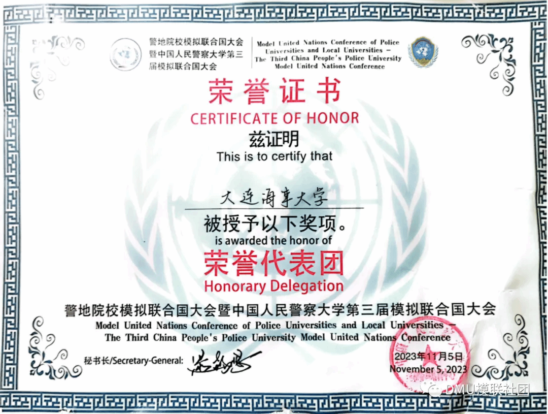 在当今全球化时代,大连海事大学学子关心世界、用国际眼光来思考和讨论问题,为了更好提高自己对国际局势的认识和理解和培养团队协作能力,模联成员参加了中国人民警察大学于11月3-5日举办警地院校模拟联合国大会暨第三届模拟联合国大会。