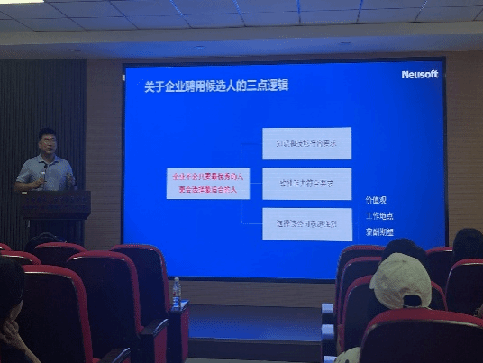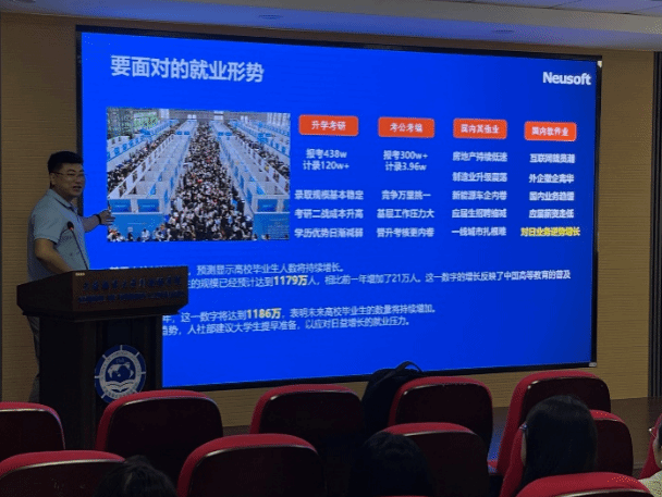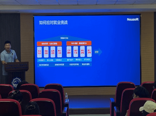潘亮首先通过数据分析了2025年毕业生求职的严峻形势,呼吁大家重视就业问题。接着,围绕如何应对就业挑战这一问题,他提出,在向内求解,让自己变强的同时,也要向外拥抱机会。最后,他对东软集团2025年的校招政策进行了讲解,对我校外国语学院同学加入东软集团表达了期待。