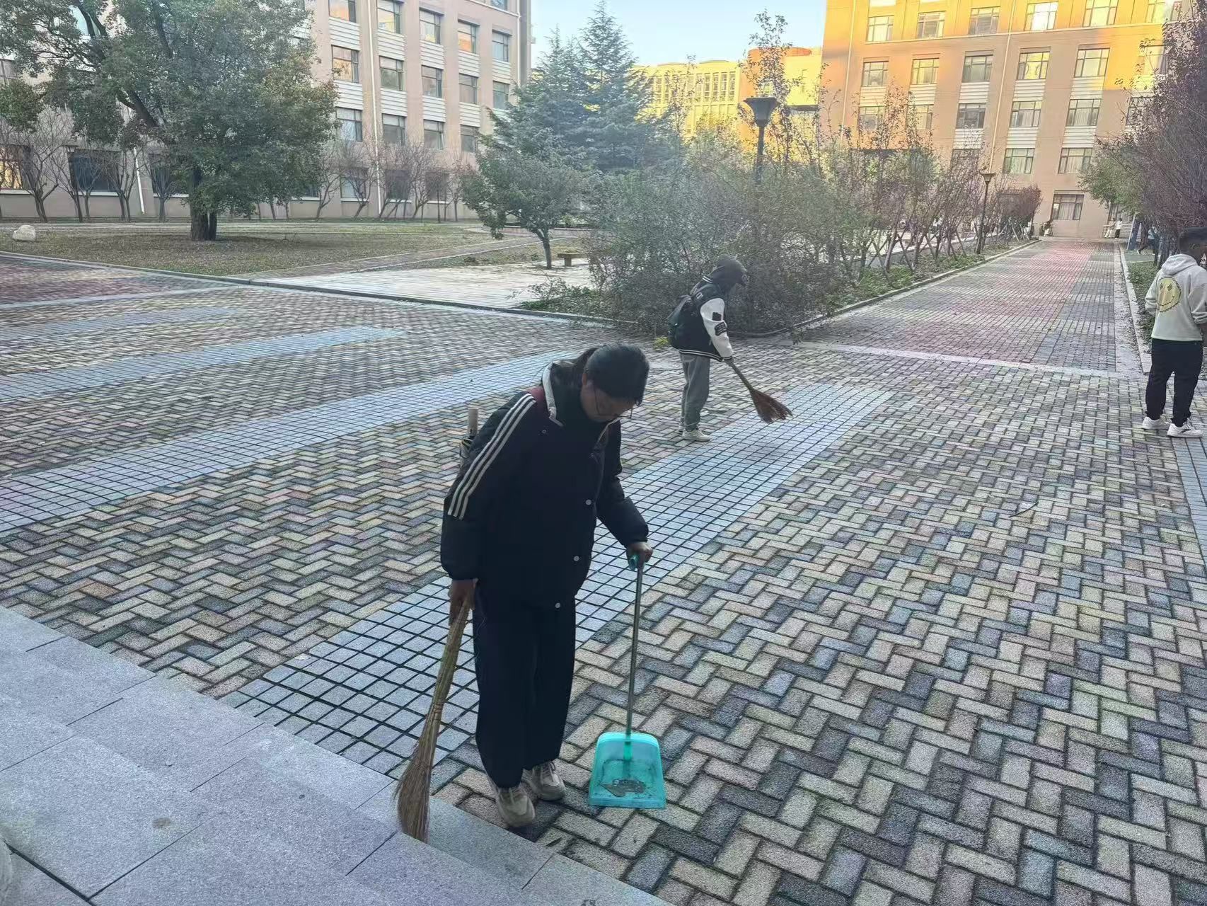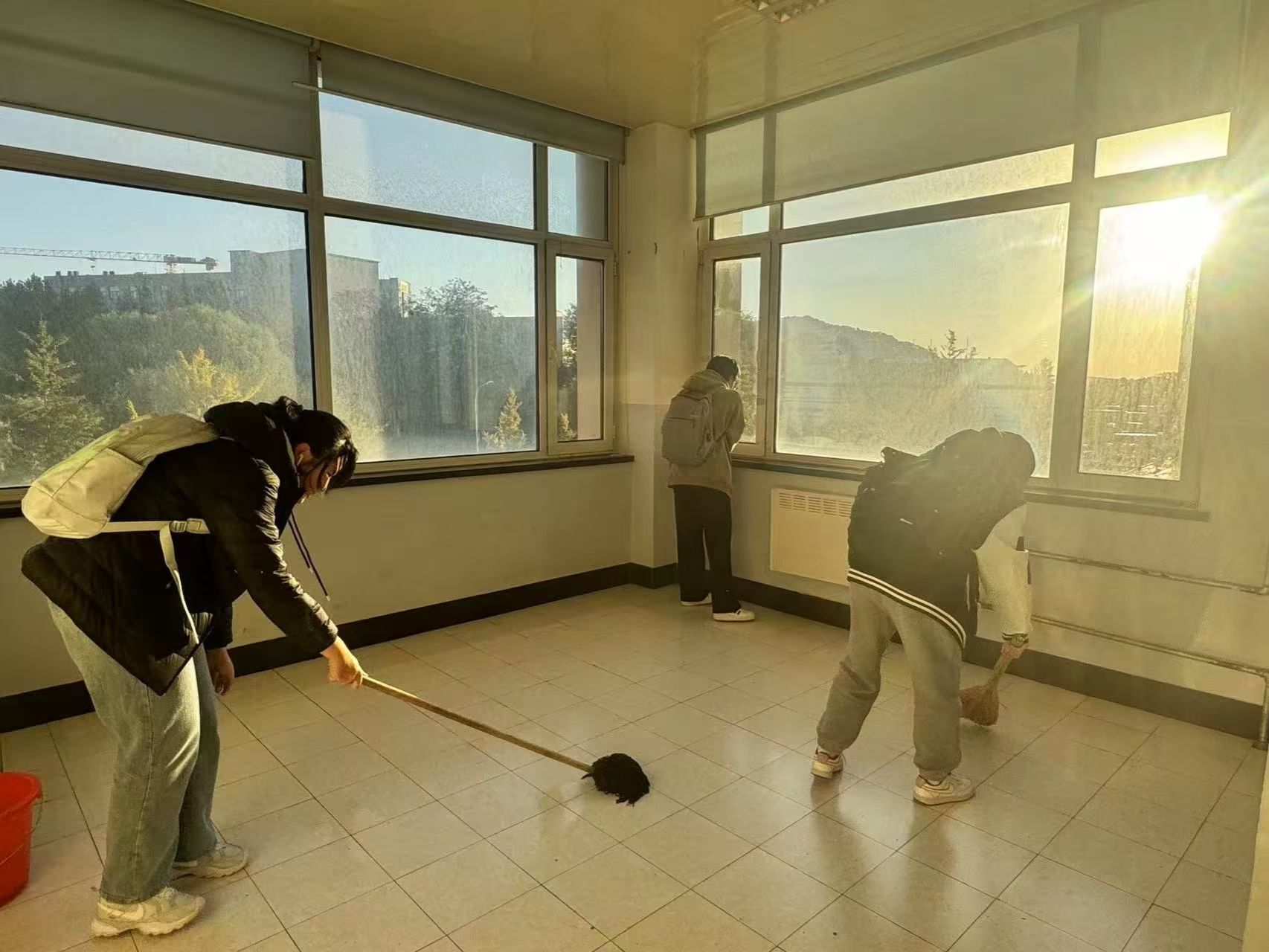 劳动过程中,同学们热情饱满、分工协作,展现出良好的精神风貌。大一年级学生对教室、楼道进行了清扫,消除卫生死角;大二学生细致清洁教室和公共区域,保障日常教学环境整洁;高年级学生和研究生重点清理人员流动频繁的一楼大厅及楼外区域,对落叶、杂物进行全面清除。整个活动组织有序、推进有力,劳动场面温馨而热烈。