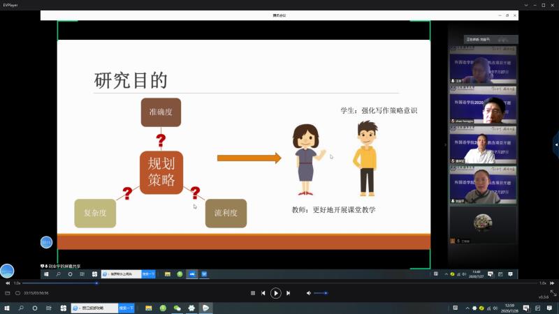 外国语学院于2020年7月27日下午1:00在腾讯会议上举行2020年校级教改项目开题会议。会议由外国语学院曾罡院长主持,赵宏宇、鹿学军、王芳及陶金老师担任评委。11位项目负责人分别就项目背景、目的、意义、方法、具体研究计划等内容进行开题答辩。