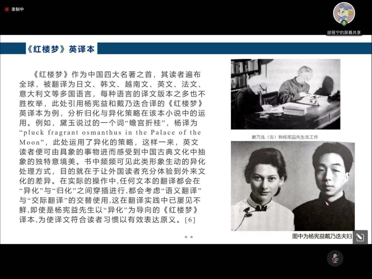 在下午的两个平行分论坛中,共有13名同学先后进行了论文宣读。第一分论坛由英语系副主任付科老师主持,罗卫华、刘迎春、严苡丹、许莹莹和付科五位老师担任评委。郑广思同学展示了对“海上丝绸之路”纪行《真腊风土记》英译本的深度翻译研究;李思雨同学以must、have to和have got to为例,基于变异语言学视角,对英语情态构式进行了多元定量研究;钟慧同学基于批评话语分析视角,结合认知语言学相关理论,对中美主流媒体在北京冬奥会报道中的词汇特征进行分析;任晓静同学采用基于语料库的定量研究方法,探讨了英语中制约will和be going to构式变体选择的主要因素;林奕冰同学以“先有蛋还是先有鸡”为例,巧妙引入了英语中名词和形容词并列二项式结构的对比研究,并对制约各自词序选择的主要因素进行了详细阐释;员霄冉同学对《红楼梦》前80回英译本中“白”的翻译在物件、诗歌、习语等五个方面的区别及其深层原因进行了剖析;邰筱宁同学讨论了归化与异化翻译策略在文学和影视作品中的应用。第二分论坛由日语系主任解礼业老师主持,王正良、胡旖怩、解礼业、郭锐与周芷冰五位老师担任评委。吕佩莹同学以海上丝绸之路为背景,对《萍洲可谈》中海洋文化的俄译策略进行探究;常亦李同学对中日两国与“虫”有关的惯用语的隐喻对比研究;金杰同学展示了语料库驱动的《山海经》俄译本名词翻译策略研究;孔思琪同学对1980-2022年间中日两国徐福文化研究进行了全面综述;王婷同学对布尔加科夫与余华小说的创作特点进行了比较研究;张瀚文同学基于《黄帝内经》平行语料库,对中医疾病术语中的俄译策略进行分析。此外,在中场休息的茶歇环节,胡悦涵同学进行了题为“当代医学术语构词法分析”的海报展示,并逐一回答了观众的提问。各位同学的发言准备充分,条理清晰,有理有据,得到了点评专家们的充分肯定。