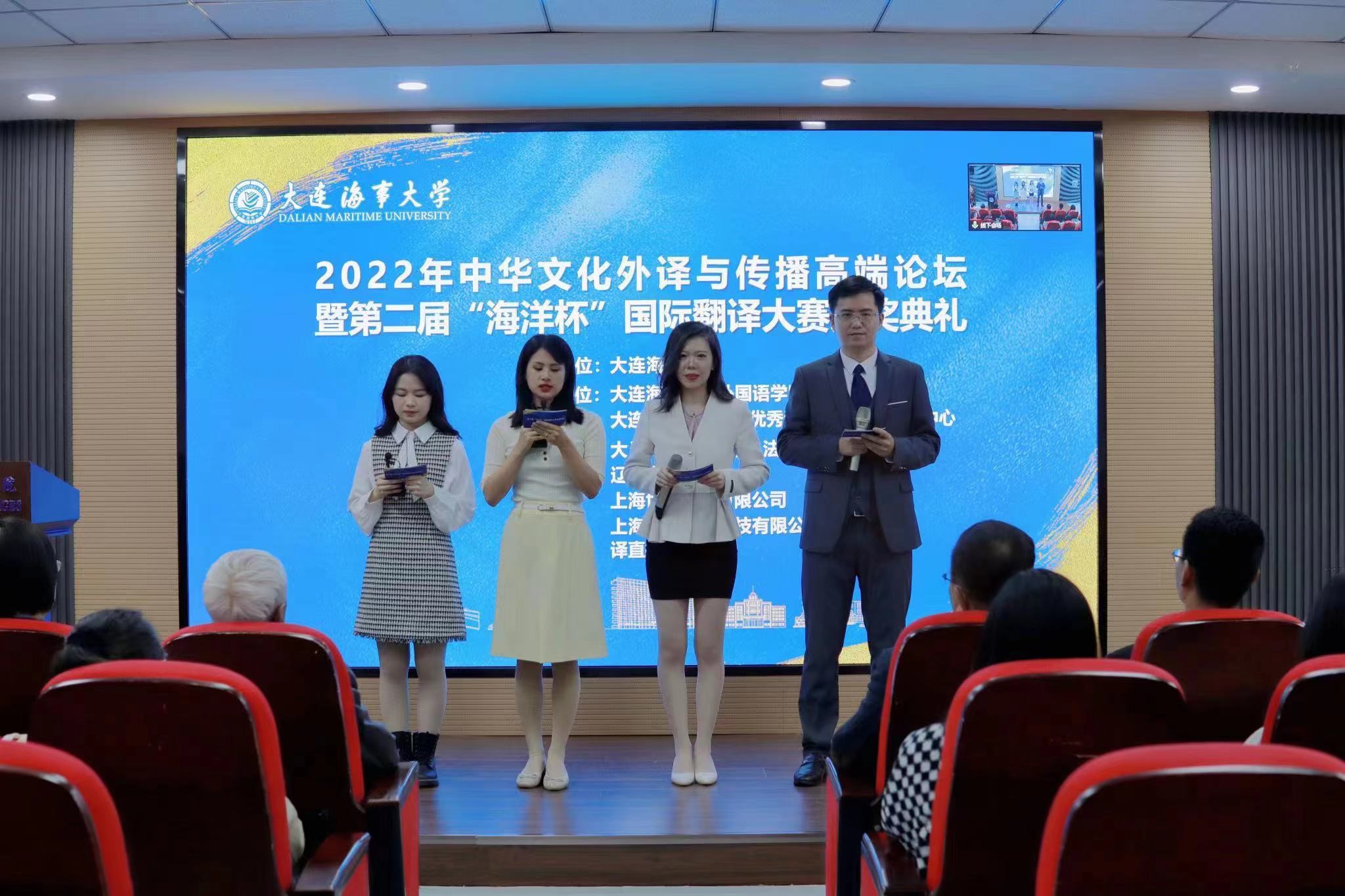 11月11至12日,“中华文化外译与传播高端论坛暨第二届‘海洋杯’国际翻译大赛颁奖典礼”在我校召开。本次论坛由大连海事大学主办,大连海事大学外国语学院、大连海事大学中华优秀海洋文化外译研究中心承办,大连海事大学海洋法治与文化研究院、辽宁省翻译学会、上海世语翻译有限公司、上海一者信息科技有限公司、译直播协办,旨在进一步加强国家高端智库培育建设,深入开展中华优秀文化外宣外译研究,弘扬传承中华优秀传统文化,有效服务中华优秀文化“走出去”战略,扩大国际影响、提升国家形象,讲好中国故事,将社会主义核心价值观融入于交流的主体人,体现于交流的客体物,通过承载中华优秀传统文化的人和物,最大限度地彰显中华文化的亲和力,赢得国际社会的理解和认同,巩固新时代中国文化价值体系的国际地位。
