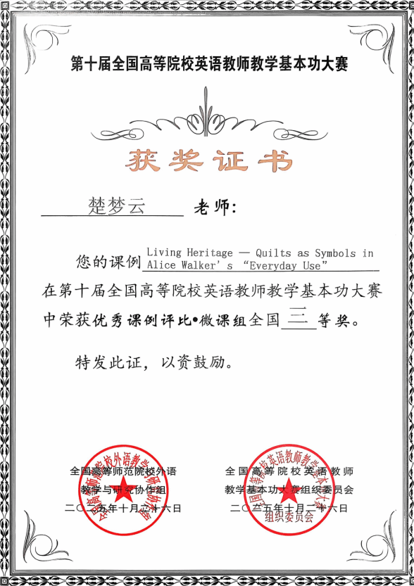 另外,我院杨扬老师提交的微课作品《议论文四步驳论法》获得全国二等奖;楚梦云老师提交的微课作品《活态遗产——艾丽斯·沃克,<日用家当>中的拼布艺术象征》获得全国三等奖。