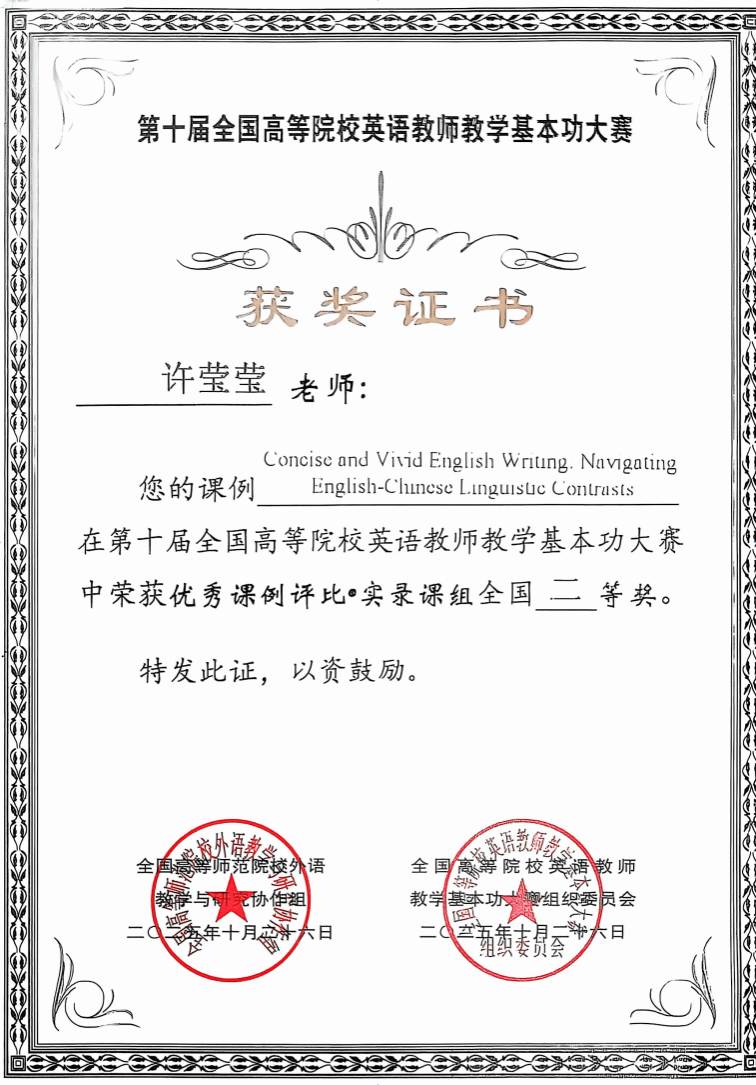 近日,由全国高等师范院校外语教学与研究协作组、全国高等院校英语教师教学基本功大赛组织委员会联合举办的“2025年全国高等院校英语教学学术年会暨第十届全国高等院校英语教师教学基本功大赛”在江苏南京圆满落幕。我院教师凭借扎实的教学功底与创新的教学设计脱颖而出,斩获国赛二等奖2项,三等奖1项的优异成绩,充分展现了我院英语学科的教学实力与育人水平。