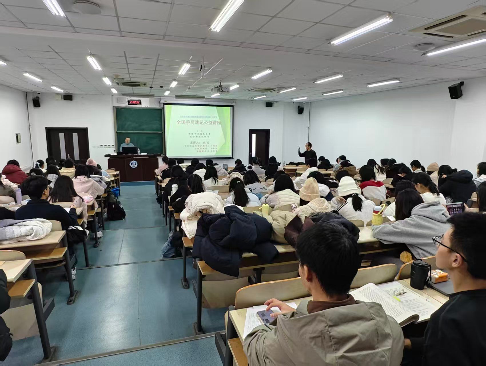 2025年12月3日下午14:00-15:30,由中国中文信息学会速记专业委员会、北京市速记协会主办,大连海事大学外国语学院承办的本年度第32场“全国手写速记公益讲座”(大连海事大学专场),在励志楼501教室如期举行。本次讲座由英语系孟庆楠副教授主持,共吸引了我校对手写速记感兴趣的师生近100人。