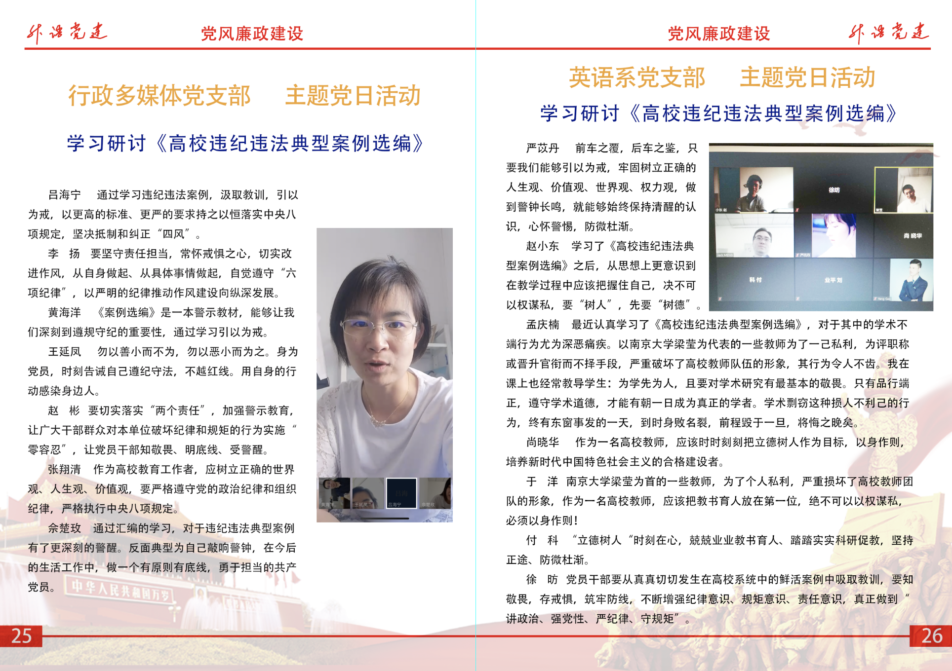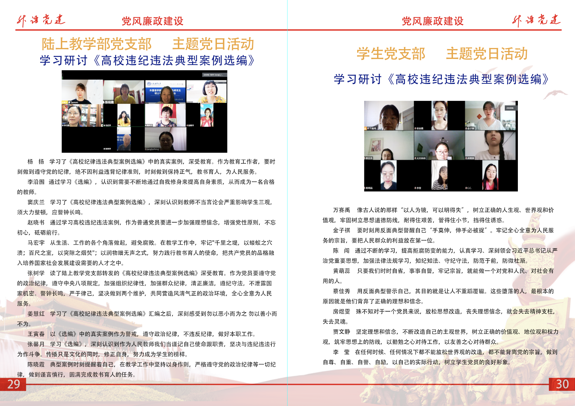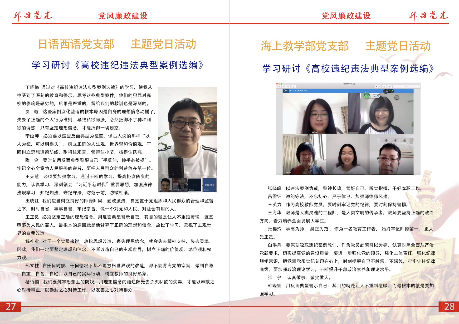 为贯彻落实学校纪委有关学习《高校违纪违法典型案例选编》的通知要求,外国语学院党委通过理论学习中心组学习、“三会一课”、主题党日等形式,组织全体党员开展对选编中违纪案件的学习研讨剖析,进一步提高党员的遵规守纪意识。