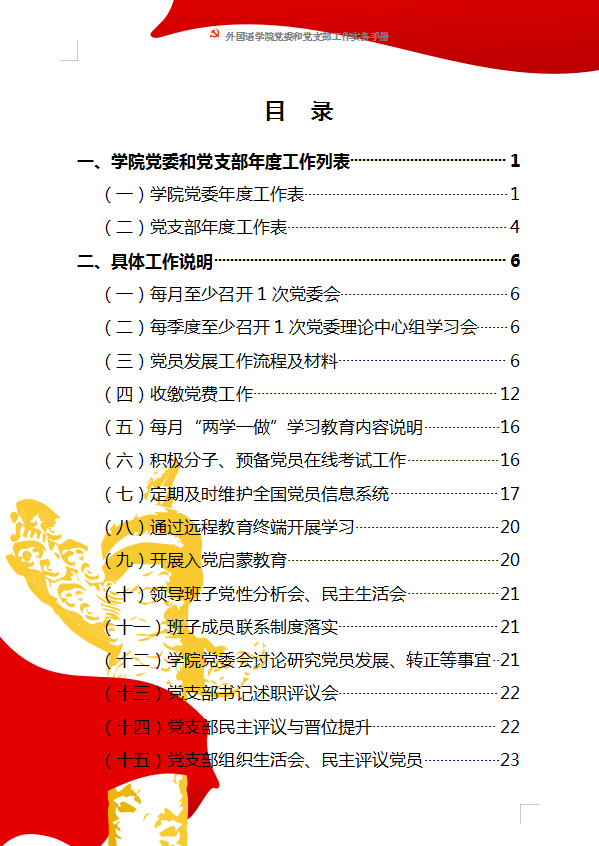 手册包括两个部分。第一部分,学院党委和党支部年度工作列表,列出了党委和党支部两个层面的全年工作条目;第二部分是具体工作说明,包括十七个方面:每月至少召开1次党委会,每季度至少召开1次党委理论学习中心组学习会,党员发展工作流程及材料,收缴党费工作,每月“两学一做”学习教育内容说明,积极分子、预备党员在线考试工作,定期及时维护全国党员信息系统,通过远程教育终端开展学习,开展入党启蒙教育,领导班子党性分析会、民主生活会,班子成员联系制度落实,学院党委会讨论研究党员发展、转正等事宜,党支部书记述职评议会,党支部民主评议与晋位提升,党支部组织生活会、民主评议党员,党支部成立、换届、补选,学院党委换届等各项工作具体操作说明。