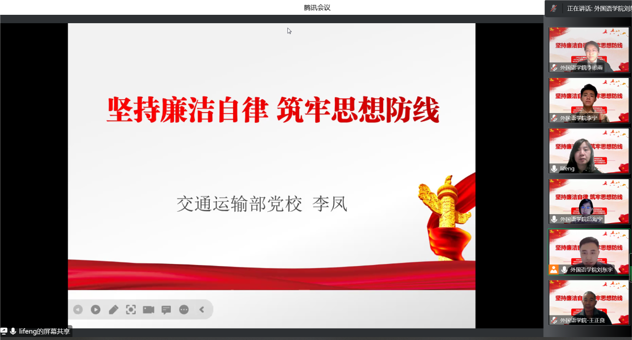 10月19日,外国语学院邀请交通运输部党校马列教研室李凤主任在线上讲授党风廉政建设专题讲座。外国语学院党委书记吕海宁、外国语学院纪委书记丁晓梅、留学生教育中心党支部书记刘绍满、继续教育学院党支部书记张世锋,外国语学院、留学生教育中心、继续教育学院的全体师生党员参加讲座。讲座由外国语学院党办主任刘东宇主持。