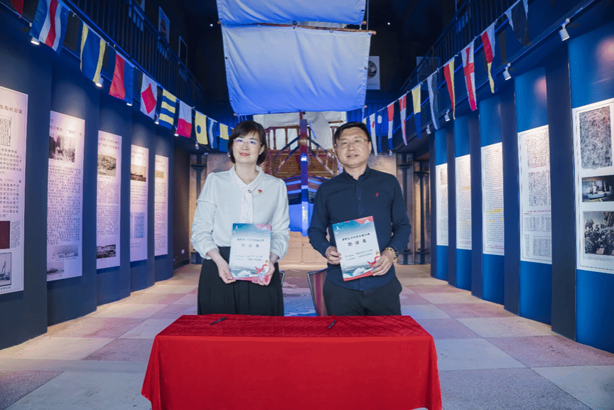 吕海宁与航海历史文化馆(大连)基地馆长孙永胜签署爱国主义教育基地共建协议书并共同揭牌。