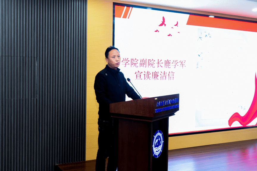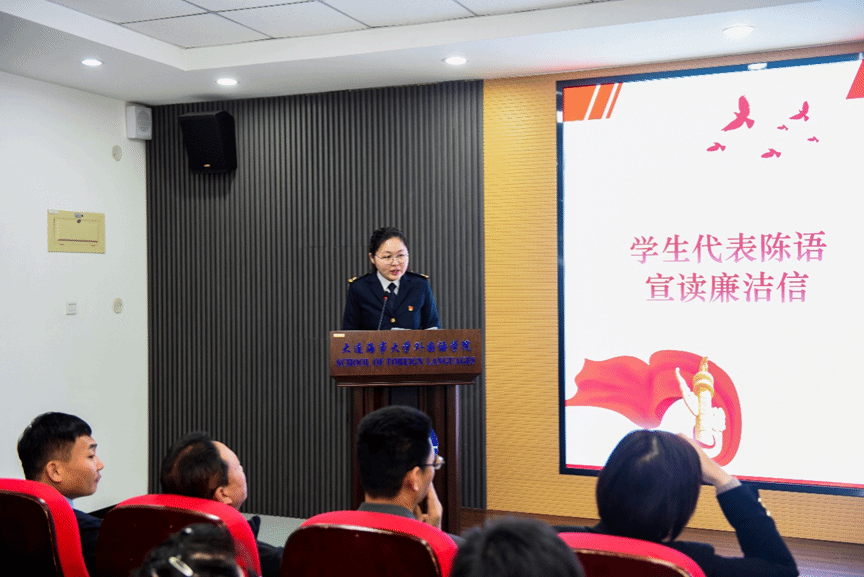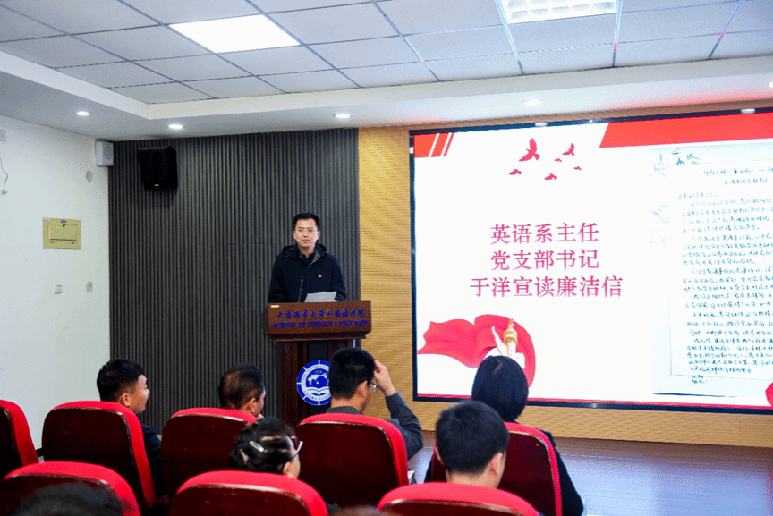 学院副院长鹿学军、英语系主任、党支部书记于洋、2020级本科生陈语宣读“给自己的廉洁信”。以对未来的自己赠言的形式共同勉励师生不断增强廉洁意识、纪律意识、规矩意识,筑牢思想防线,在廉洁问题上不妥协、不动心。