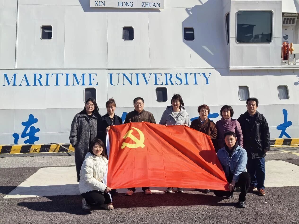 为进一步推动学院“一融双高”及“双带头人”教师党支部书记“强国行”专项建设,外国语学院党委组织海上及陆上教研室党员教师赴“新红专”轮开展“红专映初心 奋楫勇当先”主题党日活动。学院党委书记吕海宁带队参观并讲授微党课。大连海事大学何庆华船长对吕海宁一行的到来表示热烈欢迎,并对船舶的总体情况及设计背景做了简要介绍。该轮船长69.8米,型宽10.9米,型深5米,设计吃水3.5米,设计航速18节,排水量1480吨。作为全球首艘智能研究与实训两用船,实现了智能化全覆盖,驾、机、电深度融合,智能化程度达到世界领先水平,其核心系统完全由中国自主研发和制造。在驾驶台,老师们在何庆华船长的带领下,参观并详细了解了舵柄,电子海图,航海雷达,GPS,AIS等设备的使用用途及英文称谓。何船长还向老师们科普了陀螺罗经和磁罗经主要区别、误差来源以及适用场景。