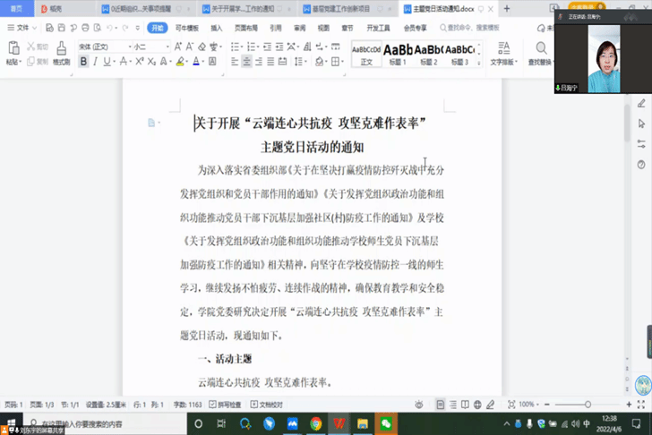 吕海宁书记对学院党委组织开展“云端连心共抗疫 攻坚克难作表率”主题党日作部署安排。她指出为深入落实省委组织部《关于在坚决打赢疫情防控歼灭战中充分发挥党组织和党员干部作用的通知》等精神,向坚守在学校疫情防控一线的师生学习,继续发扬不怕疲劳、连续作战的精神,确保教育教学和安全稳定,学院党委研究决定开展“云端连心共抗疫攻坚克难作表率”主题党日活动。本次主题党日活动有五项内容:一是开展专题学习、二是组织集中研讨、三是讲好线上微党课、四是实施“心连心”活动、五是开展特色活动。吕海宁书记强调,各党支部要加强组织领导,充分调动党员的积极性、主动性和创造性,扎实有效开展主题党日活动,切实发挥广大党员的先锋模范作用,为坚决打赢疫情防控攻坚战凝聚合力。